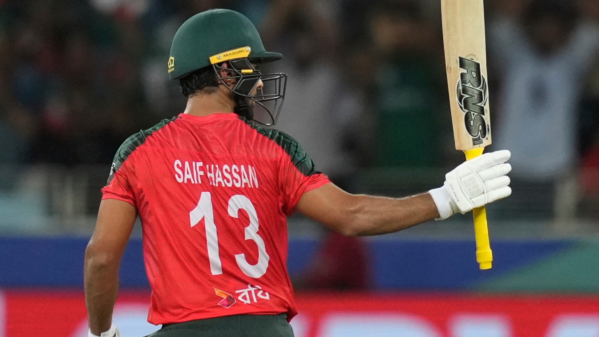 ಗುರಿಯನ್ನು ಬೆನ್ನಟ್ಟಿದ ಬಾಂಗ್ಲಾದೇಶದ ಆರಂಭ ಕಳಪೆಯಾಗಿತ್ತು. ಆರಂಭಿಕ ತಂಜಿದ್ ಹಸನ್ ಸೊನ್ನೆ ಸುತ್ತಿದರು. ಎರಡನೇ ವಿಕೆಟ್ಗೆ ಸೈಫ್ ಹಸನ್ ಹಾಗೂ ಲಿಟನ್ ದಾಸ್ ಜೋಡಿ ಅರ್ಧಶತಕದ ಜೊತೆಯಾಟದ ಕಾಣಿಕೆ ನೀಡಿತು. ಲಿಟನ್ ದಾಸ್ 3 ಬೌಂಡರಿ ನೆರವಿನಿಂದ 23 ರನ್ ಸಿಡಿಸಿದರು. ಮೂರನೇ ವಿಕೆಟ್ಗೆ ಸೈಫ್ ಹಸನ್, ತೌಹಿದ್ ಹೃದೊಯ್ ಜೋಡಿ ಅಮೋಘ ಪ್ರದರ್ಶನ ನೀಡಿತು. ಈ ಜೋಡಿ 45 ಎಸೆತಗಳಲ್ಲಿ 54 ರನ್ ಕಲೆ ಹಾಕಿತು. ಆರಂಭಿಕ ಸೈಫ್ ಹಸನ್ 2 ಬೌಂಡರಿ, 4 ಸಿಕ್ಸರ್ ಸಹಾಯದಿಂದ 61 ರನ್ ಬಾರಿಸಿ ಇಲ್ಲದ ಹೊಡೆತಕ್ಕೆ ಮುಂದಾಗಿ ಔಟ್ ಆದರು.