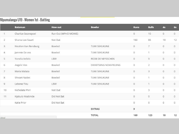 ಅಂಡರ್-19 ಮಹಿಳೆಯರ ಟ್ವೆಂಟಿ-20 ಕ್ರಿಕೆಟ್ನಲ್ಲಿ ಈಸ್ಟರ್ನ್ಸ್ ತಂಡದ ವಿರುದ್ಧ ಮಪುಮಲಂಗ ತಂಡದ ಆರಂಭಿಕ ಆಟಗಾರ್ತಿ ಶಾನಿಯಾ-ಲೀ ಸ್ವಾರ್ಟ್ ಏಕಾಂಗಿ ಹೋರಾಟ ನಡೆಸಿ ಭರ್ಜರಿಯಾಗಿ 160 ರನ್ ಗಳಿಸಿದರು.