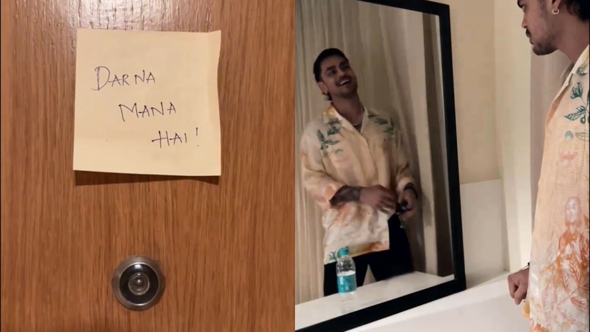 ಇಶಾನ್ ಕಿಶನ್ ಹೊಟೇಲ್ ರೂಮಿಗೆ ಹೋಗುತ್ತಿರುವುದನ್ನು ವಿಡಿಯೋದಲ್ಲಿ ಕಾಣಬಹುದು. ಕೋಣೆಯ ಗೇಟ್ ತಲುಪಿದ ತಕ್ಷಣ, "ಡರ್ನಾ ಮನಾ ಹೈ!" ಎಂದು ಬರೆದಿರುವ ಸ್ಟಿಕ್ಕರ್ ಅನ್ನು ಅವರು ನೋಡುತ್ತಾರೆ. ಇದನ್ನು ನೋಡಿ ಬೆಚ್ಚಿಬೀಳದೆ ಅವರು ಕೋಣೆಗೆ ಹೋಗುತ್ತಾರೆ. ಇದರ ನಂತರ, ಇಶಾನ್ ಕನ್ನಡಿಯ ಮುಂದೆ ನಿಂತು ಬಾಟಲಿಯನ್ನು ತಿರುಗಿಸಲು ಪ್ರಾರಂಭಿಸುತ್ತಾರೆ.