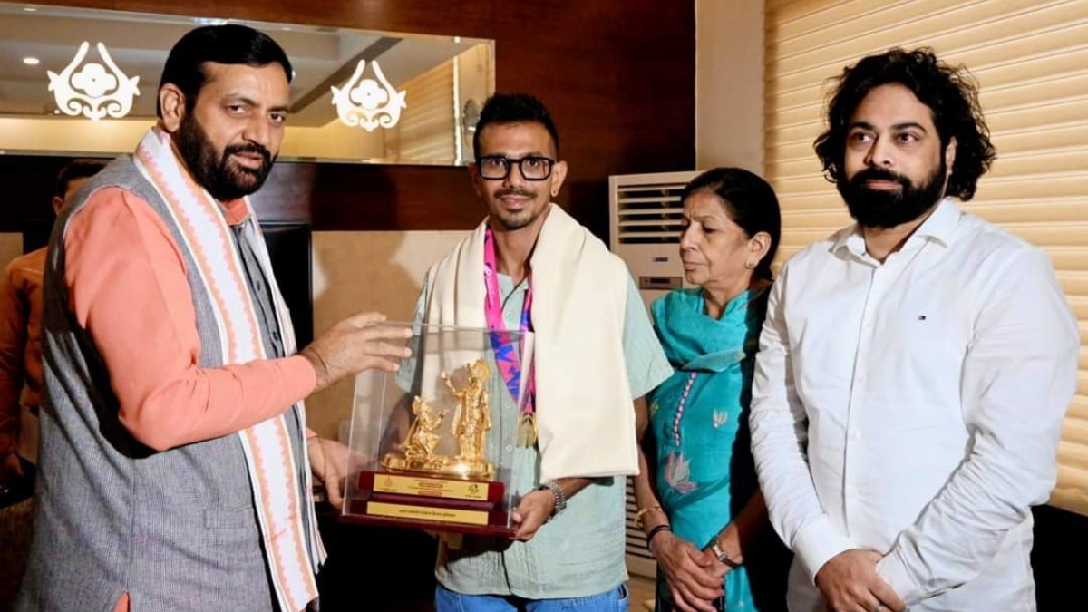 ಹರಿಯಾಣ ಸಿಎಂ ನಯಾಬ್ ಸಿಂಗ್ ಸೈನಿ ಅವರು ಯುಜ್ವೇಂದ್ರ ಚಹಾಲ್ ಅವರನ್ನು ಭೇಟಿ ಮಾಡಿ ಸನ್ಮಾನಿಸಿದ್ದಾರೆ. ಈ ವೇಳೆ ಯುಜಿ ಸಿಎಂ ಪದಕ ಪ್ರದಾನ ಮಾಡಿರುವುದು ವಿಶೇಷವಾಗಿದೆ.