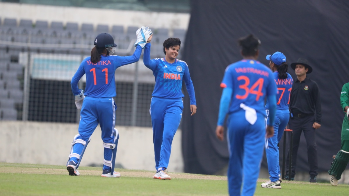 ಬೌಲಿಂಗ್ನಲ್ಲಿ ಮ್ಯಾಜಿಕ್ ಮಾಡಿದ ಭಾರತ ತಂಡದ ದೀಪ್ತಿ ಶರ್ಮಾ 4 ಓವರ್ಗಳಲ್ಲಿ 12 ರನ್ ನೀಡಿ 3 ವಿಕೆಟ್, ಶಫಾಲಿ ವರ್ಮಾ 3 ಓವರ್ಗಳಲ್ಲಿ 15 ರನ್ ನೀಡಿ 3 ಪಡೆದು ಮಿಂಚಿದರು. ಮಿನ್ನು ಮಣಿ 4 ಓವರ್ಗಳಲ್ಲಿ 2 ರನ್ ನೀಡಿ 2 ಪಡೆದರೆ, ಬಾರೆಡ್ಡಿ ಅನುಷಾ ಒಂದು ವಿಕೆಟ್ ಪಡೆದರು.