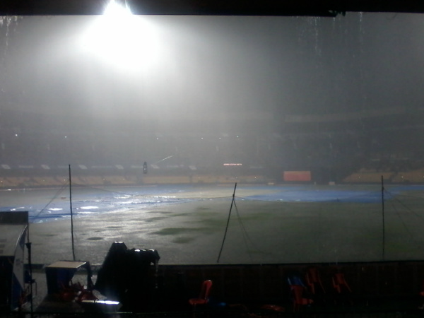ಬೆಂಗಳೂರು, ಏ. 13: ಕ್ರಿಸ್ ಗೇಲ್ ಬ್ಯಾಟ್ ನಿಂದ ಬೌಂಡರಿ, ಸಿಕ್ಸರ್ ಸುರಿಮಳೆ ನೀರಿಕ್ಷೆ ಮಾಡಿದ್ದ ಬೆಂಗಳೂರಿಗರ ಆಸೆಗೆ ವರುಣದೇವ ತಣ್ಣೀರು ಎರಚುತ್ತಾನೆ ಎಂದು ಹೇಳಲಾಗಿತ್ತು. ಆದರೆ ಸೋಮವಾರ ಮಧ್ಯಾಹ್ನವೇ ಸುರಿದ ಮಳೆ ಪಂದ್ಯ ನಡೆಯಲು ಅವಕಾಶ ಮಾಡಿಕೊಟ್ಟಿದೆ.