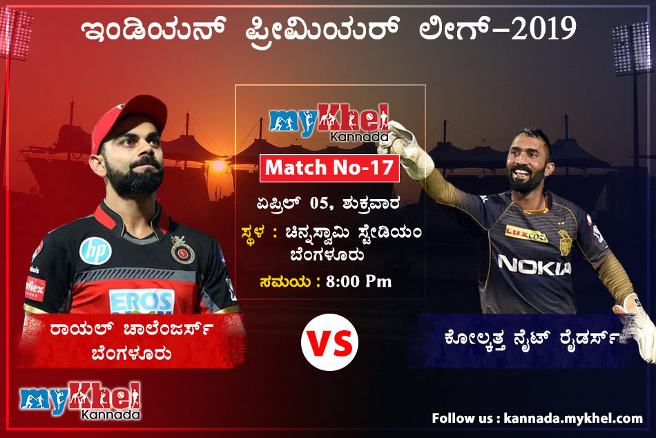 ಬೆಂಗಳೂರು, ಏಪ್ರಿಲ್ 05: ಇಂಡಿಯನ್ ಪ್ರೀಮಿಯರ್ ಲೀಗ್ (ಐಪಿಎಲ್ ) 2019ರ 17ನೇ ಪಂದ್ಯದಲ್ಲಿಂದು ಮೊದಲ ಗೆಲುವು ಸಾಧಿಸಲು ವಿರಾಟ್ ಕೊಹ್ಲಿ ನೇತೃತ್ವದ ರಾಯಲ್ ಚಾಲೆಂಜರ್ಸ್ ಬೆಂಗಳೂರು ತಂಡ ಕಣಕ್ಕಿಳಿಯಲಿದೆ. ಇಂದಿನ ಪಂದ್ಯದಲ್ಲಿ ಕೋಲ್ಕತ್ತಾ ನೈಟ್ ರೈಡರ್ಸ್ ವಿರುದ್ಧ ಆಡಲಿದೆ.