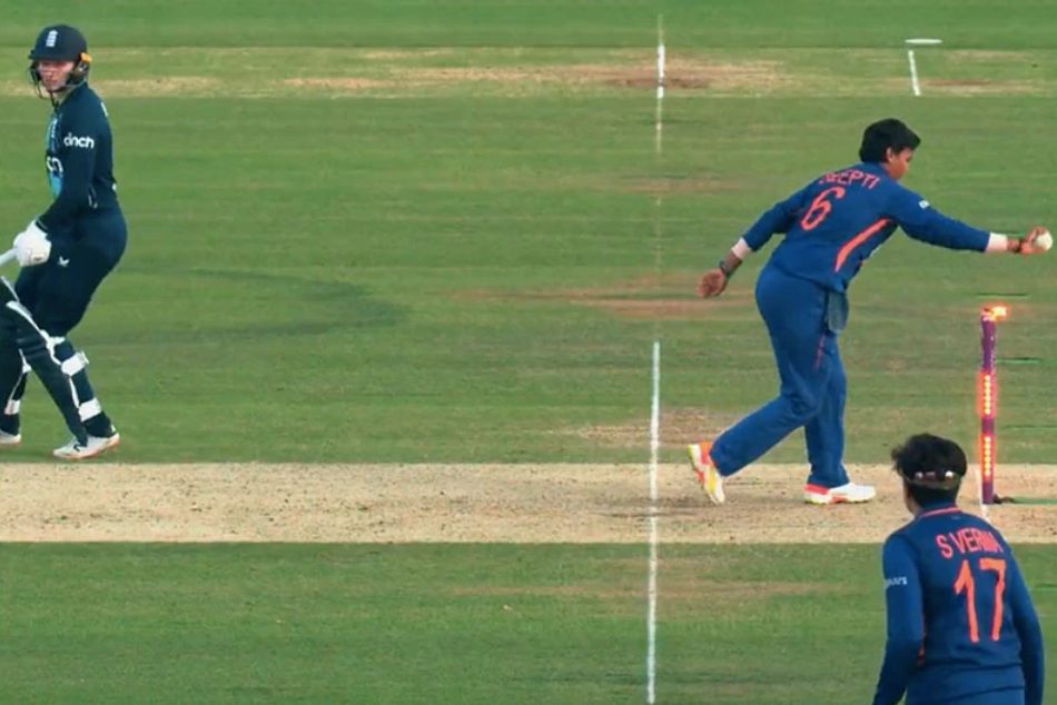 ತನ್ನ ಎಸೆತವನ್ನು ಎಸೆಯಲು ಓಡಿ ಬರುತ್ತಿರುವಾಗ ಕ್ರೀಸ್ನಿಂದ ಹೊರಗಿರುವುದನ್ನು ಕಂಡ ದೀಪ್ತಿ ಬೇಲ್ಗಳನ್ನು ಕೆಡವಿ, ಭಾರತಕ್ಕೆ 16 ರನ್ಗಳ ಗೆಲುವು ಮತ್ತು ಇಂಗ್ಲೆಂಡ್ನ ವಿರುದ್ಧ 3-0 ಏಕದಿನ ಸರಣಿಯನ್ನು ಕ್ಲೀನ್ ಸ್ವೀಪ್ ಮಾಡಿತು.