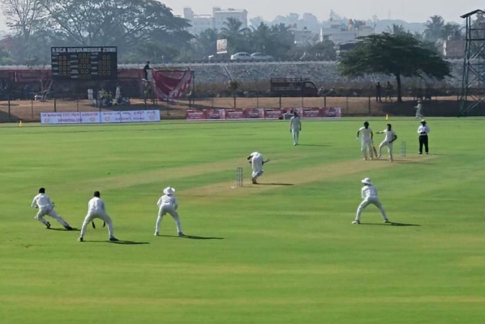 ಶಿವಮೊಗ್ಗ: ಶಿವಮೊಗ್ಗದ ನಗರದ ನವುಲೆ ಕರ್ನಾಟಕ ರಾಜ್ಯ ಕ್ರಿಕೆಟ್ ಕ್ರೀಡಾಂಗಣದಲ್ಲಿ ಕರ್ನಾಟಕ ಮತ್ತು ಮಧ್ಯ ಪ್ರದೇಶದ ನಡುವೆ ರಣಜಿ ಪಂದ್ಯಾಟ ನಡೆಯುತ್ತಿದೆ. ಮೂರನೇ ದಿನದಾಟದಲ್ಲಿ ಕರ್ನಾಟಕ ಪಂದ್ಯದ ಮೇಲೆ ಹಿಡಿತವನ್ನು ಸಾಧಿಸಿದೆ. ಟಾಸ್ ಗೆದ್ದ ಮಧ್ಯಪ್ರದೇಶದ ತಂಡ ಕರ್ನಾಟಕ ತಂಡಕ್ಕೆ ಮೊದಲು ಬ್ಯಾಟ್ ಮಾಡಲು ಆಹ್ವಾನಿಸಿತು.