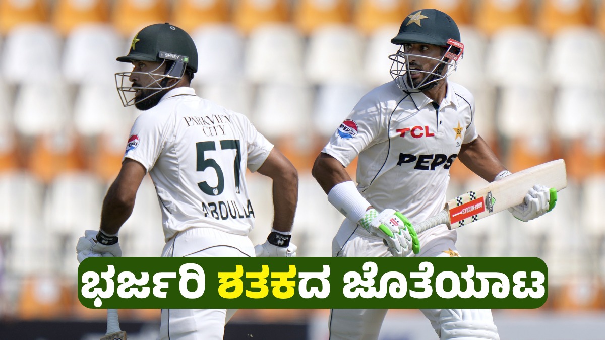 ಅಬ್ದುಲ್ಲಾ ಶಫೀಕ್ ಮತ್ತು ಶಾನ್ ಮಸೂದ್ ಎರಡನೇ ವಿಕೆಟ್ಗೆ ಅಮೋಘ ಜೊತೆಯಾಟದ ಕಾಣಿಕೆ ನೀಡಿದರು. ಇವರು 338 ಎಸೆತಗಳನ್ನು ಎದುರಿಸಿ 253 ರನ್ ಬಾರಿಸಿ ತಂಡದ ಮೊತ್ತವನ್ನು ಹಿಗ್ಗಿಸುವಲ್ಲಿ ಶ್ರಮಿಸಿದರು. ಅಬ್ದುಲ್ಲಾ ಶಫೀಕ್ 184 ಎಸೆತಗಳಲ್ಲಿ 10 ಬೌಂಡರಿ, 2 ಸಿಕ್ಸರ್ ಸಹಾಯದಿಂದ 102 ರನ್ ಬಾರಿಸಿ ಅಬ್ಬರಿಸಿದರು. ಇನ್ನು ನಾಯಕ ಶಾನ್ ಮಸೂದ್ 13 ಬೌಂಡರಿ, 2 ಸಿಕ್ಸರ್ ನೆರವಿನಿಂದ 151 ರನ್ ಸಿಡಿಸಿ ಅಬ್ಬರಿಸಿದರು. ಪಾಕ್ ತಂಡದ ಪರ ಸ್ಟಾರ್ ಆಟಗಾರ ಬಾಬರ್ ಅಜಮ್ 30 ರನ್ ಬಾರಿಸಿ ನಿರಾಸೆ ಅನುಭವಿಸಿದರು.