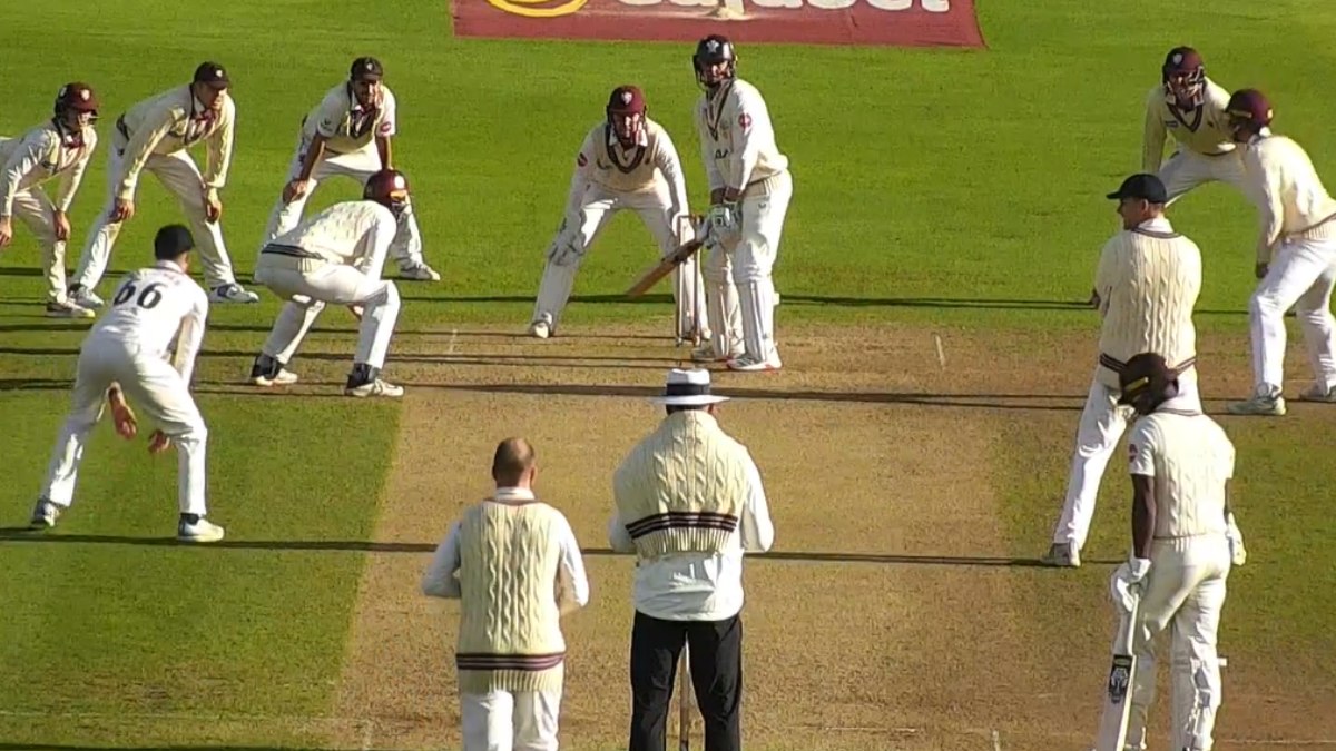 10 ನಿಮಿಷಗಳ ಆಟ ನಿಜಕ್ಕೂ ರೋಚಕತೆ ಹೆಚ್ಚಿಸಿತ್ತು. ಕ್ರಿಕೆಟ್ನಲ್ಲಿ ಬಲು ಅಪರೂಪದ ಫೀಲ್ಡ್ ಸೆಟ್ಟಿಂಗ್ನ್ನು ಸೋಮರ್ಸೆಟ್ ನಾಯಕ ಮಾಡಿದ್ದರು. 3 ಸ್ಲಿಪ್, 1 ಲೆಗ್ ಸ್ಲಿಪ್, 2 ಶಾರ್ಟ್ ಲೆಗ್, 1 ಸಿಲ್ಲಿ ಪಾಯಿಂಟ್ ರೂಪದಲ್ಲಿ ನಿಂತಿದ್ದರು. ಎಲ್ಲಾ ಫೀಲ್ಡರ್ಗಳು ಬ್ಯಾಟ್ಸ್ಮನ್ನನ್ನು ಸುತ್ತುವರೆದಿದ್ದರು.