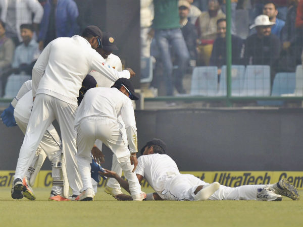 ಭಾರತದ ಎರಡನೇ ಇನ್ನಿಂಗ್ಸ್ ನ 6ನೇ ಓವರ್ ಜಾರಿಯಲ್ಲಿರುವಾಗ ಶ್ರೀಲಂಕಾದ ವೇಗಿ ಸುರಂಗ ಲಕ್ಮಲ್ ಅವರು ವಾಂತಿ ಮಾಡಿಕೊಂಡರು. ನಂತರ ಧನಂಜಯ ಡಿ ಸಿಲ್ವಾ ವಾಂತಿ ಕೂಡ ಮಾಡಿಕೊಂಡಿದ್ದಾರೆ. ಆಂಟಿ ಪೊಲ್ಯುಶನ್ ಮಾಸ್ಕ್ ಧರಿಸಿ ಆಡುತ್ತಿದ್ದರೂ ಸಿಂಹೀಳಿಯರು ಮಾಲಿನ್ಯಕ್ಕೆ ತತ್ತರಿಸಿದ್ದಾರೆ.