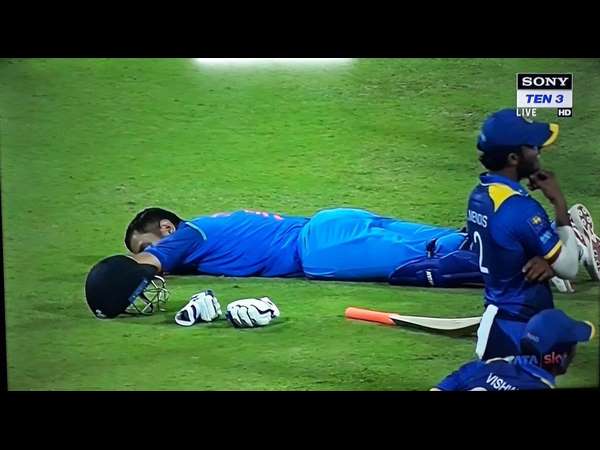 ಇತ್ತ ಧೋನಿ ಮಾತ್ರ ಇದ್ಯಾವುದಕ್ಕೂ ತಲೆಕೆಡಿಸಿಕೊಳ್ಳದೆ, ಮೈದಾನದಲ್ಲೇ ಬೋರಲಾಗಿ ಮಲಗಿ ಕೊಂಚ ವಿಶ್ರಾಂತಿ ಪಡೆದುಕೊಂಡರು. ಕೆಲ ನಿಮಿಷಗಳ ಬಿಡುವಿನ ನಂತರ, ಗಲಾಟೆ ತಣ್ಣಗಾದ ಮೇಲೆ ಪುನಃ ಆಟ ಶುರುವಾಗಿ ಭಾರತ ಗೆಲುವು ಸಾಧಿಸಿತು. (ಚಿತ್ರ: ಸಮೀರ್ ಅಲ್ಲಾನಾ ಟ್ವಿಟ್ಟರ್ ಖಾತೆ)