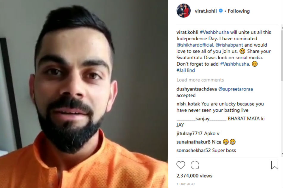 ಮಾನ್ಯವಾರ್ ಬ್ರ್ಯಾಂಡ್ ಉಡುಪು ತೊಟ್ಟ ಕೊಹ್ಲಿ ಅವರು 72ನೇ ಸ್ವಾತಂತ್ರ್ಯೋತ್ಸವ ಸಂದರ್ಭದಲ್ಲಿ ಸಾಂಪ್ರದಾಯಿಕ ಉಡುಗೆ ತೊಟ್ಟು ಆಗಸ್ಟ್ 15ರಂದು ಫೋಟೊ ತೆಗೆದು ಕಳಿಸಿ ಎಂದು ಕೇಳಿಕೊಂಡಿದ್ದಾರೆ.