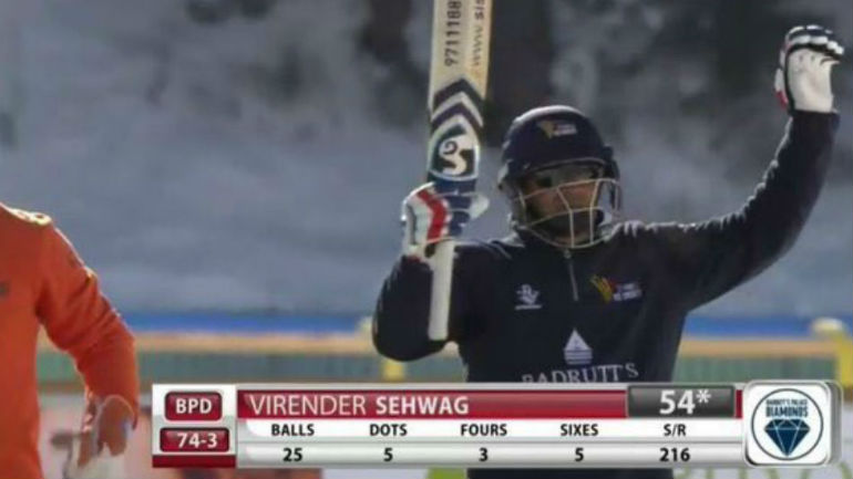 ಅವರ ಎಂದಿನ ಬ್ಯಾಟಿಂಗ್ ಶೈಲಿಯಾದ ಮೊದಲ ಬಾಲಿಗೆ ಬೌಂಡರಿ ಹೊಡೆಯುವ ಸಂಪ್ರದಾಯವನ್ನೂ ಐಸ್ಕ್ರಿಕೆಟ್ನಲ್ಲೂ ಮುಂದುವರೆಸಿದ ಸೆಹ್ವಾಗ್ ಅವರು ಇಲ್ಲಿಯೂ ಮೊದಲ ಎಸೆತದಲ್ಲಿಯೇ ಬೌಂಡರಿ ಭಾರಿಸಿದರು. ಸೆಹ್ವಾಗ್ ತಂಡ 20 ಓವರ್ಗಳಿಗೆ 164 ರನ್ಗಳಿಸಿತು.