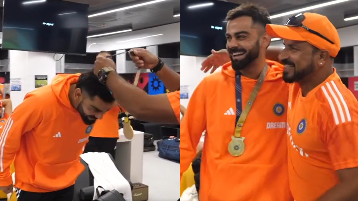 ವಿರಾಟ್ ಕೊಹ್ಲಿ ನಗುಮುಖದಲ್ಲಿ ಪದಕವನ್ನು ಫೀಲ್ಡಿಂಗ್ ಕೋಚ್ನಿಂದ ಕೊರಳಿಗೆ ಹಾಕಿಸಿಕೊಂಡರು. ವಿಡಿಯೋದ ಕೊನೆಯ ಕ್ಷಣಗಳಲ್ಲಿ ಅವರು ಪದಕವನ್ನು ಕಚ್ಚುವುದನ್ನು ನೋಡಿದಾಗ ಅವರ ತಂಡದ ಸದಸ್ಯರು ಸ್ಟಾರ್ ಕ್ರಿಕೆಟರ್ಗೆ ಹುರಿದುಂಬಿಸಿದರು.