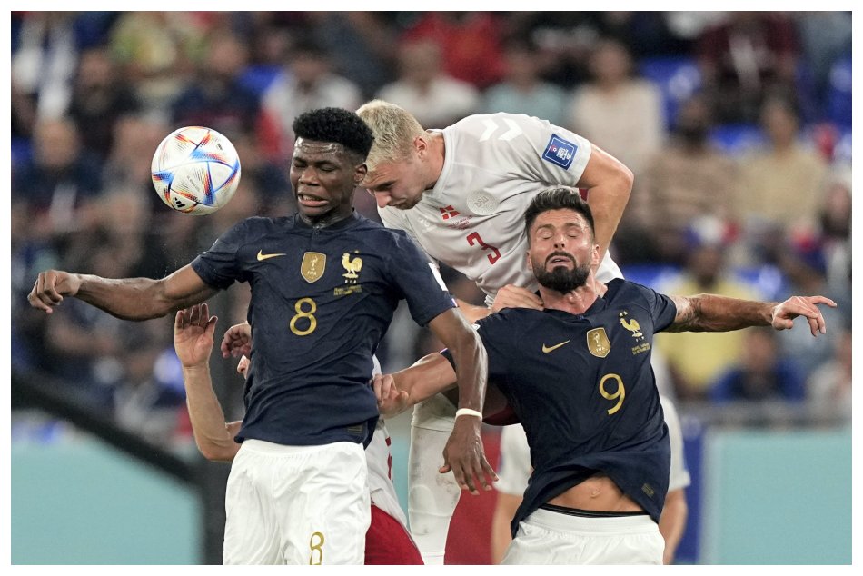 ಸ್ಟೇಡಿಯಂ 974ರಲ್ಲಿ ನಡೆದ ಈ ಪಂದ್ಯದಲ್ಲಿ 61ನೇ ನಿಮಿಷದಲ್ಲಿ ಫ್ರಾನ್ಸ್ ತಂಡದ ಪರವಾಗಿ ಮಿಡ್ ಫೀಲ್ಡ್ ಆಟಗಾರ ಕಿಲಿಯಾನ್ ಎಂಬಪ್ಪೆ ಗೋಲು ಸಿಡಿಸುವ ಮೂಲಕ ಮೊದಲ ಮೇಲುಗೈ ಒದಗಿಸಿದರು. ಹೆರ್ನಾಂಡ್ಸ್ ನೀಡಿದ ಚೆಂಡನ್ನು ಗೋಲು ಪೆಟ್ಟಿಗೆಗೆ ಸೇರಿಸುವಲ್ಲಿ ಯುವ ಆಟಗಾರ ಯಶಸ್ವಿಯಾದರು. ಅದಾಗಿ 7 ನಿಮಿಷದಲ್ಲಿ ಡೆನ್ಮಾರ್ಕ್ ಕೂಡ ಗೋಲು ದಾಖಲಿಸುವ ಮೂಲಕ ಸಮಬಲದ ಸಾಧನೆ ಮಾಡುವಲ್ಲಿ ಯಶಸ್ವಿಯಾಯಿತು. ಕ್ರಿಸ್ಟೆನ್ಸನ್ ಈ ಗೋಲು ಸಿಡಿಸಿ ಡೆನ್ಮಾರ್ಕ್ಗೆ ಯಶಸ್ಸು ನೀಡಿದರು.