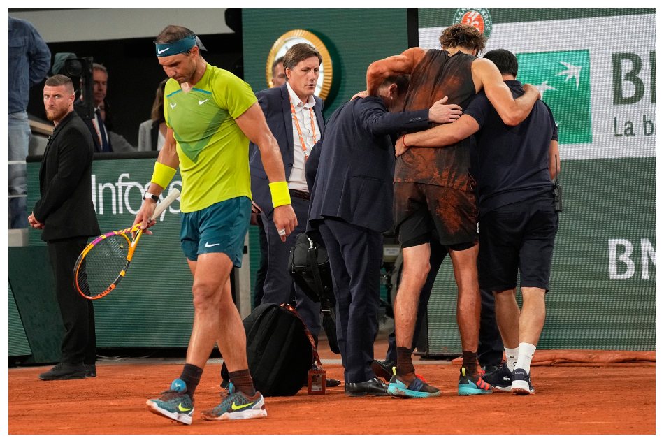 ಫ್ರೆಂಚ್ ಓಪನ್ನ ರೋಚಕ ಸೆಮಿಫೈನಲ್ ಪಂದ್ಯ ಅನಿರೀಕ್ಷಿತ ರೀತಿಯಲ್ಲಿ ಅಂತ್ಯಕಂಡಿದೆ. ಅಲೆಕ್ಸಾಂಡರ್ ಜ್ವೆರೇವ್ ಹಾಗೂ ರಾಫೆಲ್ ನಡಾಲ್ ನಡುವಿನ ಫೈನಲ್ ಹಂತಕ್ಕೇರುವ ಸೆಣೆಸಾಟದಲ್ಲಿ ಜ್ವೆರೇವ್ ಮೊಣಕಾಲು ಗಾಯಕ್ಕೆ ತುತ್ತಾದ ಕಾರಣ ಪಂದ್ಯದಲ್ಲಿ ಮುಂದುವರಿಯಲು ಅಸಮರ್ಥರಾದರು. ಹೀಗಾಗಿ ರಾಫೆಲ್ ನಡಾಲ್ ಫ್ರೆಂಚ್ ಓಪನ್ನಲ್ಲಿ ಮತ್ತೊಮ್ಮೆ ಪ್ರಶಸ್ತಿ ಸುತ್ತಿಗೇರುವಲ್ಲಿ ಯಶಸ್ವಿಯಾಗಿದ್ದಾರೆ.
